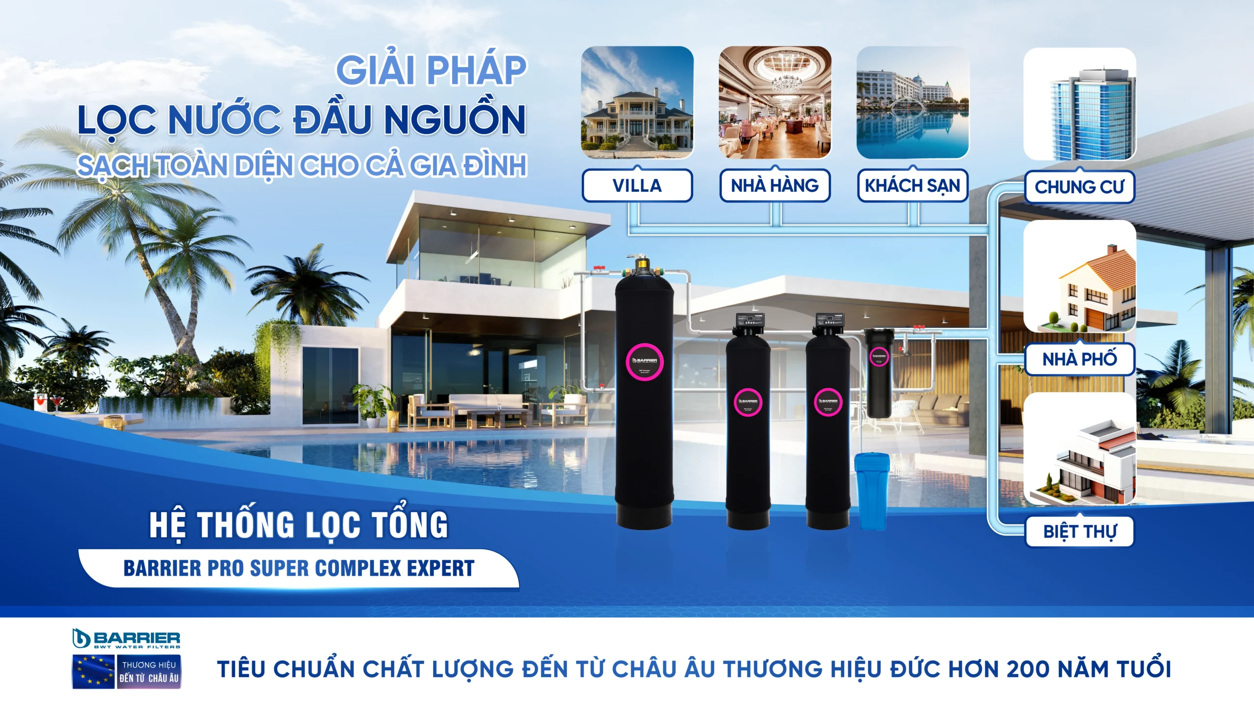 Hệ thống lọc nước đầu nguồn BARRIER Pro Super Complex Expert là giải pháp xử lý nước sinh hoạt toàn diện, ứng dụng công nghệ lọc hiện đại chuẩn châu Âu được tối ưu cho điều kiện nguồn nước phức tạp tại Việt Nam.