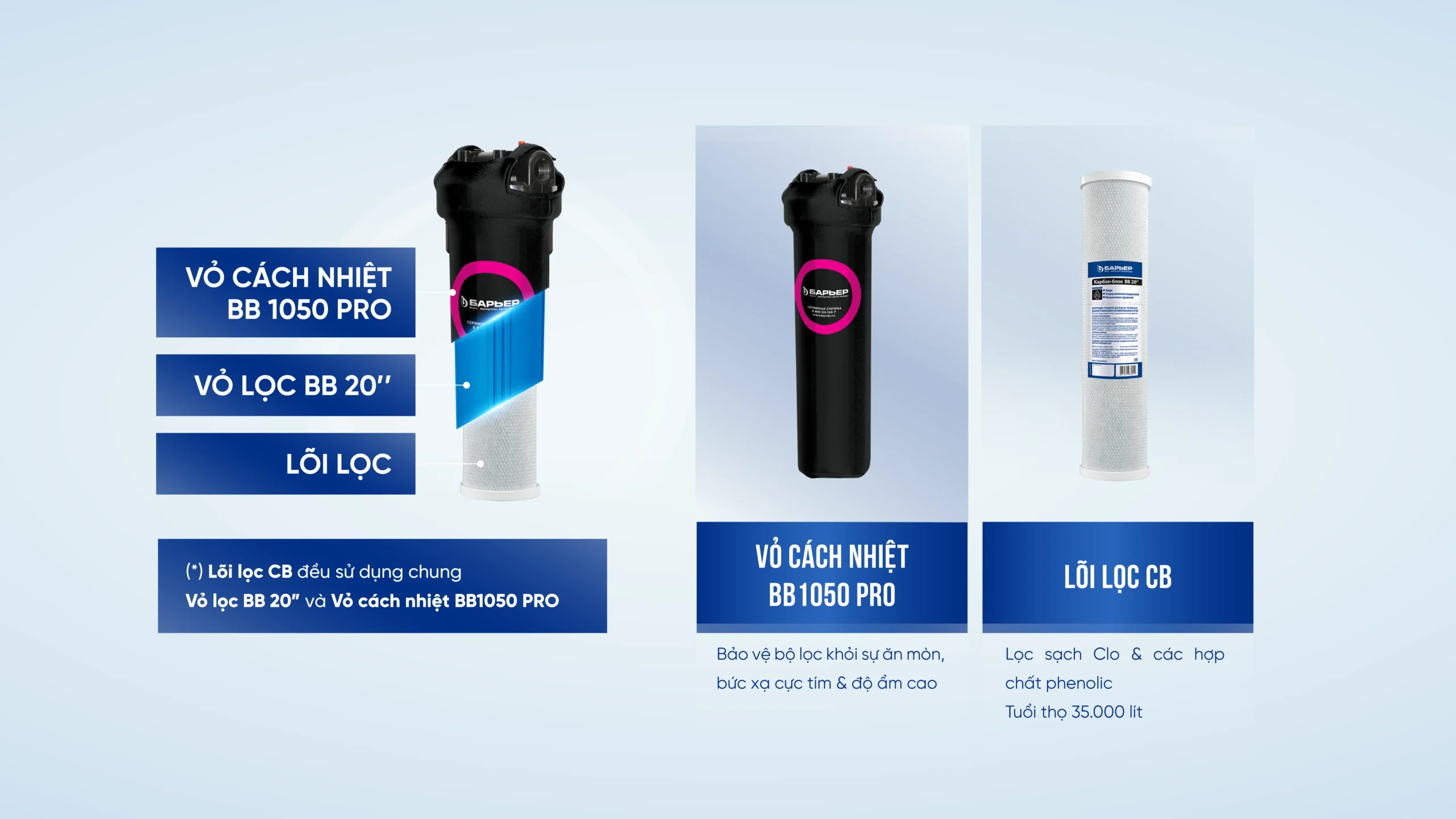 Bộ lọc BB1050 PRO được thiết kế theo tiêu chuẩn lọc Big Blue 20”, gồm ba thành phần chính: Vỏ cách nhiệt BB1050 PRO, vỏ lọc BB 20” và lõi lọc CB, mang đến sự ổn định cao trong quá trình vận hành và dễ dàng thay thế, bảo trì.