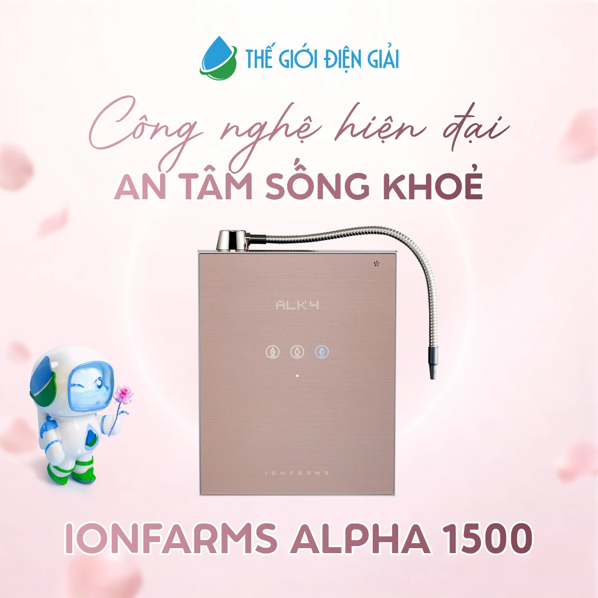 Máy lọc nước điện giải ion kiềm IonFarms Alpha-1500 được sản xuất bởi tập đoàn IonFarms Hàn Quốc nổi tiếng toàn cầu. Với những tính năng nổi bật như tạo nước ion kiềm có chỉ số ORP từ -450mV cho đến dưới -800mV, dải pH ~ 3.2 - 10.8, tạo được 7 loại nước cùng tính năng tùy chỉnh đến 49 cấp độ nước, bền bỉ đến trên 30 năm và thiết kế tràn viền với tông màu vàng hồng cá tính, IonFarms Alpha-1500 đã trở thành “người bạn đồng hành” trên hành trình sống khỏe của nhiều gia đình Việt ngay từ khi vừa ra mắt.