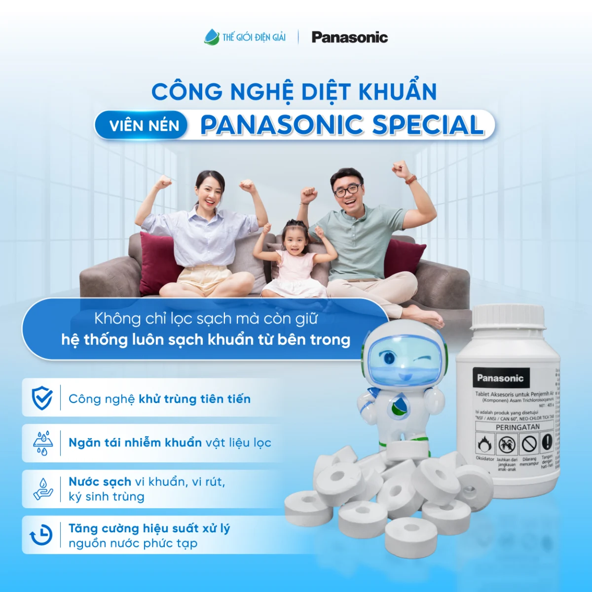 Được trang bị thêm viên nén Special diệt khuẩn - khử trùng độc quyền của Panasonic giúp diệt khuẩn, virus hiệu quả hơn và là chất xúc tác giúp lọc sắt hòa tan trong nước (Các sản phẩm thông thường đa số chỉ lọc được sắt ở dạng chất rắn)
