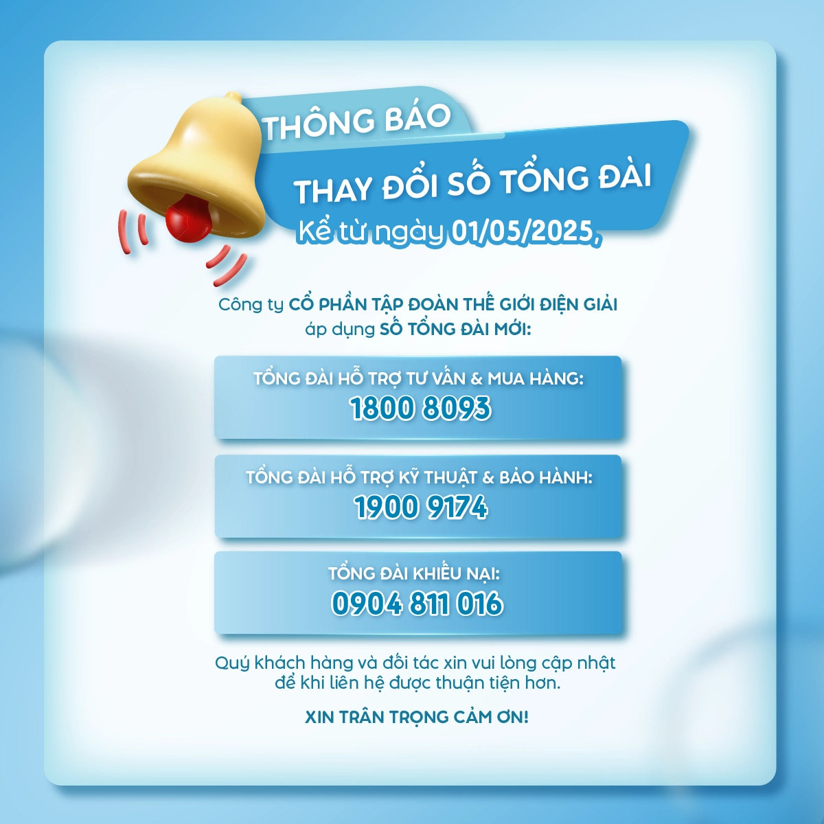 Kể từ thời điểm trên, các số tổng đài cũ sẽ chính thức ngừng hoạt động. Quý Khách hàng và Quý Đối tác vui lòng cập nhật và lưu trữ thông tin số tổng đài mới của Thế Giới Điện Giải để thuận tiện hơn trong việc liên hệ khi cần hỗ trợ tư vấn, bảo hành hoặc khiếu nại.